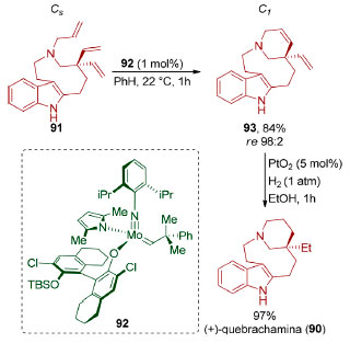 Em 2008, Hoveyda, Schrock e colaboradores utilizaram uma reação de dessimetrização baseada em metátese intramolecular de olefinas na síntese total do alcaloide da família Aspidosperma, (+)-quebrachamina (90, Esquema 22).109 O catalisador de molibdênio utilizado (92) possui quiralidade no metal e no ligante. A metátese de fechamento de anel enantiosseletiva do trieno 91 forneceu o dieno tetracíclico 93 (84%), em excelente enantiosseletividade (re 98:2). Reação de hidrogenação das duplas ligações (97%), empregando-se o catalisador de Adams (PtO2), forneceu o produto natural (+)-quebrachamina (90).