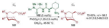 Em 2015, o grupo de Dixon desenvolveu uma reação de dessimetrização enantiosseletiva, via catálise por enamina, na aminocetona cíclica proquiral 101 (Esquema 24).111 A etapa de dessimetrização consistiu em uma adição de Michael de uma enamina, formada in situ, a um éster α,β-insaturado levando à construção de três estereocentros (rd > 98:2 e re > 91,5:8,5). O heterociclo 103 formado apresenta o esqueleto 2-azabiciclo[3.3.1]nonano, fragmento estrutural presente em vários produtos naturais como os da família dos morfanos. É interessante notar que quando um éster α,β-insaturado de geometria Z foi utilizado, o mesmo diastereoisômero foi obtido, porém na forma racêmica. Apesar desse controle do substrato, a enantiosseletividade é resultado das múltiplas interações covalentes e não-covalentes com o catalisador 102.