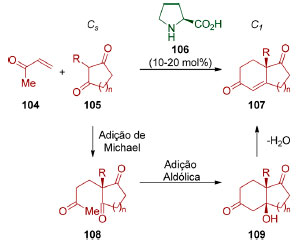 A reação de ciclização entre uma 1,3-dicetona cíclica 105 e uma cetona α,β-insaturada 104, um caso particular de uma anelação de Robinson que envolve uma adição de Michael, seguida por uma condensação aldólica intramolecular para formar o sistema bicíclico 107 contendo um estereocentro quaternário que oferece a oportunidade de dessimetrização.112 Em 2000, Barbas e colaboradores demonstraram a generalidade de uma anelação de Robinson assimétrica catalisada por prolina (106, Esquema 25).113