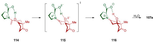 ![]() Esquema 27. Etapa estereodeterminante para formação organocatalisada da cetona de Hajos-Parrish-Eder-Sauer-Wiechert (107a). Nível de teoria utilizado para os cálculos das energias do estado de transição (B3LYP/6-31+G(d,p))122