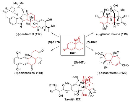 Para n=2 (Esquema 27), obtém-se a chamada cetona de Wieland−Miescher (107b) que foi utilizada na síntese total de vários produtos naturais como o (−)-penitrem D (117),124 (+)-halenaquinol (118),125 (−)-glaucarubolona (119),126 a (−)-escabronina G (120)127 e o Taxol® (121).128,129 A presença de sub-estruturas decalínicas em vários desses produtos naturais e a disposição das carbonilas na cetona de Wieland-Miescher 107b viabilizou a conversão desta em sistemas tri-, tetra- ou pentacíclicos (Esquema 28).