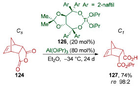 Processos catalíticos também foram desenvolvidos para a abertura de anidridos cíclicos meso mediante o uso de nucleófilos aquirais. Em 1998, Seebach e colaboradores desenvolveram o uso de complexos de Ti(IV)-TADDOL (126), tanto em quantidades estequiométricas quanto catalíticas, para a dessimetrização de anidridos cíclicos (Esquema 30).131 Apesar de ser altamente enantiosseletiva (re 98:2), a versão catalítica ainda sofre com longos tempos reacionais (24 dias de reação).