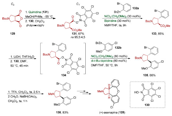 ![]() Esquema 31. Dessimetrização utilizada na síntese formal da (+)-asenapina (128), por Baran e colaboradores132