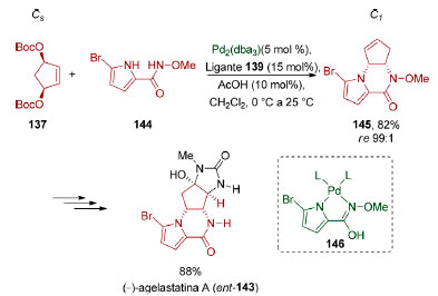 ![]() Esquema 32. Dessimetrização através de catálise via paládio aplicada à síntese da (+)-agelastatina A (143), por Trost e colaboradores134