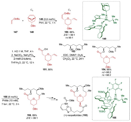 ![]() Esquema 34. Síntese total do (+)-neopeltolídeo (152) através de uma dessimetrização via metátese de olefinas, por Hoveyda, Schrock e colaboradores136