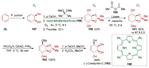 Esterificação de 151 com o álcool secundário 153 (88%) viabilizou a formação do éster 154 contendo todos os carbonos do macrociclo presente no produto final 152 (Esquema 34). Visando otimizar uma reação de macrociclização via metátese de fechamento de anel, os grupos de pesquisa de Hoveyda e Schrock desenvolveram um novo catalisador de molibdênio 155 que permitiu reduzir a carga de catalisador mesmo frente à baixa reatividade da olefina gem-dissubstituída de 154. O produto de macrociclização 156 (Z/E >99:1, 89%) foi então convertido no (+)-neopeltolídeo (152). A reação de di-hidroxilação enzimática de anéis aromáticos permite a obtenção de blocos de construção quirais de grande utilidade sintética. Em 1991, Johnson e colaboradores utilizaram o diol obtido por di-hidroxilação do benzeno (5) através de um processo quimioenzimático, promovido por Pseudomonas putida (Esquema 35).137 Após a conversão do diol 157 no acetonídeo meso 159 (53%), este foi submetido a uma quebra de simetria por acetilação promovida por P. cepacia (Amano P-30) que forneceu 161 (90%, re > 97,5:2,5). Esterificação de Mitsunobu (100%), seguida por hidrólise do acetonídeo e dos ésteres de 162 (84%), completou a síntese do (−)-conduritol C (163), um representante de uma família de produtos naturais que apresentam propriedade de inibição de glicosidases.
