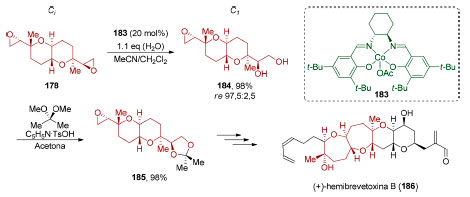 O complexo de cobalto 183 contendo um ligante do tipo Salen foi o ácido de Lewis utilizado pelo grupo de Nelson como catalisador para abertura do epóxido meso centrossimétrico 178 (Esquema 39). A mono-hidratação do substrato centrossimétrico deu-se em excelente enantiosseletividade (98%, re 97,5:2,5), viabilizando a obtenção do composto bicíclico 184 contendo seis centros estereogênicos. A dessimetrização de epóxidos meso contendo um plano de simetria é muito utilizada em Síntese Orgânica,146 mas esse é o primeiro exemplo de uma dessimetrização de um bis-epóxido centrossimétrico. O produto 184 foi então utilizado em uma síntese formal da (+)-hemibrevetoxina B (186).