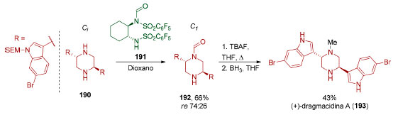 O grupo de Nelson utilizou o reagente de formilação quiral 191 para a dessimetrização da piperazina centrossimétrica 190. Infelizmente o produto 192 foi obtido com baixa enantiosseletividade (66%, re 74:26). Uma etapa de desproteção seguida por uma redução do grupo formila viabilizou uma síntese concisa da (+)-dragmacidina A (193). As limitações desse tipo de dessimetrização sugerem que investigações nessa direção ainda se fazem necessárias.