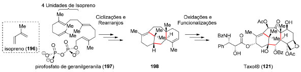 Historicamente, o reconhecimento de determinados padrões estruturais em produtos naturais foi de grande importância para estudos de biossíntese, como a "regra do isopreno (196)" para terpenoides.155 Por exemplo, a origem biossintética do Taxol® (121) apresenta duas sequências reacionais distintas (Esquema 42): as etapas de ciclização (fase das ciclases) em que as ligações carbono-carbono são formadas e a fase de ajuste dos estados de oxidação dos carbonos (fase das oxidases).156