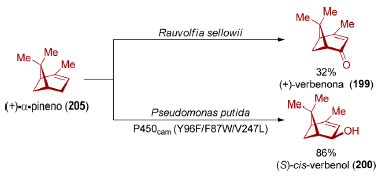 ![]() Esquema 44. Conversão biocatalisada de (+)-α-pineno (205) em (+)-verbenona (199)168 e (S)-cis-verbenol (200)161