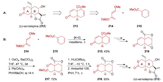 ![]() Esquema 46. Reconhecimento de padrões aplicado à (±)-vernolepina (212). A: Análise retrossintética. B: Síntese total, por Danishefsky e colaboradores172