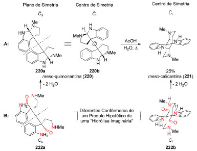 As duas primeiras representações (219a e 219b) mostram os anéis A e C da morfina (219) na direção Norte−Sul (Figura 11). Enquanto 219a é a representação mais usual, 219b destaca a conformação cadeira do anel E e barco torcido do anel C. Essas mesmas informações estão presentes na representação bidimensional 219c em que os anéis A e C estão orientados nas direções Sul−Norte. As duas últimas representações, 219d e 219e, apresentam os anéis A e C na direção Oeste−Leste e Leste−Oeste, respectivamente, e reforçam a conformação cadeira do anel E. Modelos moleculares, como o de Dreiding, apresentam elevado grau de precisão no que se refere a comprimentos, ângulos de ligação e interações estéricas e oferecem perspectivas que não podem ser facilmente apreciadas com o uso de modelos computacionais. Tais modelos permitem que um arquiteto de moléculas aprecie diferentes vistas de uma obra da natureza, tal qual arquitetos de edifícios e obras de arte apreciam seus objetivos de estudo e trabalho. Com a popularização de técnicas de impressão 3D, os químicos sintéticos em breve poderão apreciar seus objetos de interesse em modelos construídos sob demanda. A relação do reconhecimento de padrão com simetria molecular pode se expressar de várias formas. Em 1996, Overman e colaboradores desenvolveram uma síntese estereosseletiva para o alcaloide bis-pirroloindólico meso-quimonantina (220, Esquema 47A)175 que apresenta um plano de simetria em um de seus confôrmeros. Em meio ácido, este produto natural pode ser convertido na meso-calicantina (221),176,177 um isômero que contém um centro de simetria. Uma maneira de visualizar tal isomerização é considerar uma "hidrólise imaginária" de cada aminal (Esquema 47B), onde as carbonilas do dialdeído 222 estariam diante de grupos amino de aminas primárias e secundárias. Na reação de formação de hemiaminal a partir do intermediário dicarbonílico hipotético 222, tem-se então uma permuta entre os grupos amino que reagem com cada carbonila de 222. Esse não é o mecanismo real dessa isomerização que, provavelmente, deve envolver diferentes hemiaminais e íons imínio, mas apenas uma simplificação daquele. Este tipo de isomerização também está presente nos estereoisômeros quirais de simetria C2 dessa família de alcaloides.178 A síntese de compostos com esse tipo de simetria será discuta a seguir, na sessão 4.2.