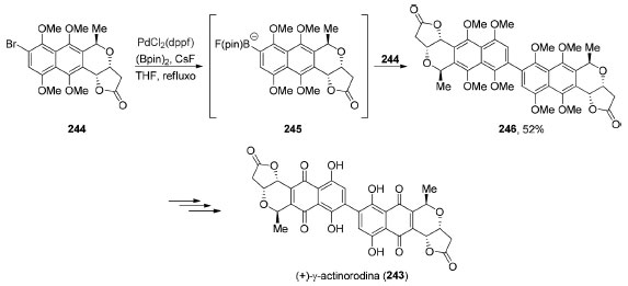 Em situações nas quais encontramos problemas de quimiosseletividade ainda não resolvidos ou a reatividade necessária não foi plenamente desenvolvida, o produto natural dimérico não pode ser preparado a partir de dois fragmentos idênticos. Nesses cenários, pequenas modificações precisam ser feitas em um dos equivalentes para que o acoplamento possa ser realizado. Em 2017, Neumeyer e Brückner completaram a síntese total da (+)-γ-actinorodina (243), uma γ-lactona naftoquinonônica dimérica (Esquema 53).189 Neste trabalho, os autores converteram um equivalente do brometo arílico 244 no correspondente boropinacolato 245. O intermediário formado 245 participa então de um acoplamento de Suzuki-Miyaura in situ com um segundo equivalente do brometo 244 levando à formação do produto dimérico 246, em 52% de rendimento. Após algumas transformações, a (+)-γ-actinorodina (243) foi obtida.