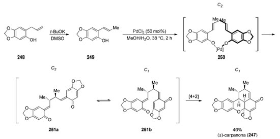 O reconhecimento de padrão faz da "dimerização" de dois fragmentos idênticos a estratégia mais lógica para sintetizar moléculas com eixo de simetria C2. Em muitos casos, não há seletividade envolvida na etapa de acoplamento, em outros é possível utilizar a reação de "dimerização" para criar centros estereogênicos e, por fim, nos casos em que há problemas de seletividade não-solucionados ou reatividade incipiente, os fragmentos a serem acoplados não são exatamente iguais. Reconhecimento de simetria escondida no planejamento sintético Enquanto a simetria presente em um alvo sintético viabiliza diversas estratégias para reduzir o número de etapas da rota sintética, essa não é a única aplicação do reconhecimento de simetria no planejamento sintético. Uma análise retrossintética cuidadosa de um alvo sintético pertencente ao grupo pontual C1 pode viabilizar o reconhecimento de uma relação de simetria ausente no produto final. Os exemplos discutidos a seguir são de sínteses convergentes onde um mesmo intermediário avançado foi utilizado para formar dois ou mais fragmentos do alvo sintético. Esse reconhecimento de padrão pode ser chamado de "simetria escondida", uma vez que a simetria em questão é virtual, resulta exclusivamente da retrossíntese. Em 1971, o grupo de Chapman190 realizou a síntese da (±)-carpanona (247), uma lignana tetracíclica dimérica (benzoxantenonas) contendo cinco estereocentros, isolada na forma de um racemato. Essa síntese foi um dos primeiros exemplos descritos de reconhecimento de simetria escondida (Esquema 54), realizada através de uma dimerização oxidativa biomimética. A isomerização da dupla ligação do grupo alila de 248 (rendimento não reportado) forneceu o monômero 249. Na presença de PdCl2 estequiométrico, Chapman e colaboradores propõem que as hidroxilas fenólicas de 249 se coordenam ao paládio, formando o intermediário chave 250. A dimerização desejada acontece através de um processo redox resultando na formação de Pd(0) e o bis-orto-quinometino (±)-251, de simetria C2, altamente reativo. Através de uma reação de hetero-Diels-Alder intramolecular, o confôrmero 251b, de simetria C1, é convertido na (±)-carpanona (247) em 46% de rendimento. Esse processo biomimético recebeu diversos estudos posteriores visando realizar a dimerização oxidativa de forma catalítica pelos grupos de Kuroda,191 Lindsley,192 Poli,193 e Kozlowski194 para obtenção de benzoxantenonas naturais assim como análogos sintéticos. Os grupos de Ley195 e Shair196 investigaram essa transformação utilizando síntese em fase sólida. Em 2006, Shair e colaboradores utilizaram síntese em fase sólida para o preparo de 10.000 análogos inspirados na estrutura da (±)-carpanona (247).197 Em 2020, Kozlowski194 e colaboradores descreveram a primeira versão enantiosseletiva dessa reação, porém com baixa enantiosseletividade (re 75:25).