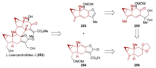 Em 2017, Liu e colaboradores aplicaram o conceito de simetria escondida na síntese do sesquiterpeno dimérico (−)-sarcandrolídeo J (252)198 cuja estrutura contém oito anéis e 11 estereocentros, três dos quais são tetrassubstituídos e dois quaternários. Eles identificaram que o anel central do sistema octacíclico deste produto natural poderia ser sintetizado através de uma cicloadição [4+2] entre o dieno presente no furano tetracíclico 253 e o γ-alquilideno butenolídeo 254 que age como dienófilo (Esquema 55). Apesar da instabilidade observada para o furano 253, ele pôde ser formado in situ via desidratação da di-hidroxicetona tricíclica 255 em meio ácido. Tanto 254 como 255 puderam ser sintetizados a partir de um mesmo intermediário avançado, o acetal da cetona tricíclica 256.