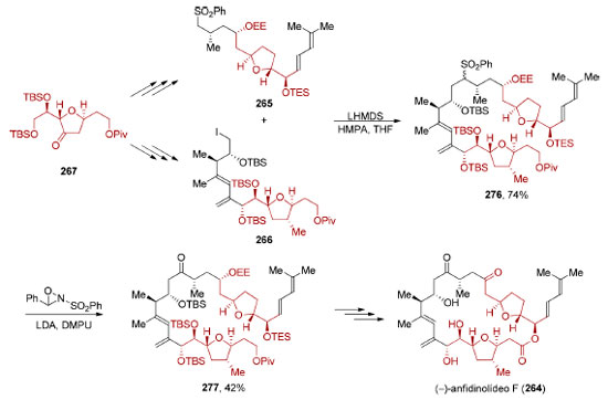 O intermediário 267 foi então aplicado na síntese de ambos os fragmentos 265 e 267 (Esquema 60). Uma α-desprotonação da sulfona de 265 viabilizou uma reação de alquilação via substituição nucleofílica em 276 (74%). A α-desprotonação da sulfona em 276 viabilizou a etapa de dessulfurização oxidativa (42%), realizada na presença de um dieno facilmente oxidável. Após uma série de etapas, 277 foi convertido no (−)-anfidinolídeo F (264).