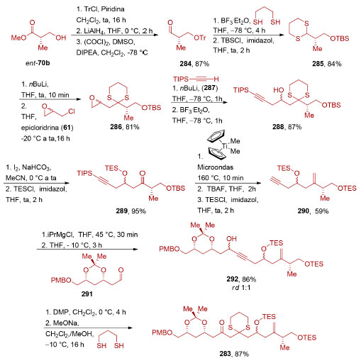 A preparação do intermediário avançado 283 pelo grupo de Ley204 utilizou o éster de Roche ent-70b de configuração S como precursor quiral (Esquema 62). Proteção da hidroxila livre de ent-70b e etapas redox (87%), seguidas por formação de 1,3-ditiana e reproteção (84%), levaram à formação do intermediário 285. Litiação da 1,3-ditiana 285 viabilizou uma abertura de epóxido da epicloridrina racêmica, acompanhada por uma reação SN2 intramolecular, que formou o epóxido terminal 286 (81%). Abertura do epóxido 286 utilizando o ânion de lítio do TIPS-acetileno litiado (287, 87%), etapas de proteção e desproteção e uma olefinação de Tebbe resultaram na formação do enino 290 (56%). Adição do alcino terminal em 290 ao aldeído 291 formando 292 (86%, rd 1:1), seguida de oxidação via periodinana de Dess-Martin e formação de β-ceto-1,3-ditiana205 (87%), completaram a preparação da mistura de epímeros 283.