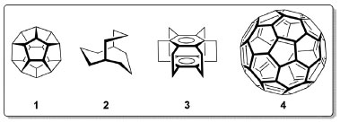 ![]() Figura 1. Compostos de simetria elevada. Dodecaedrano (1), biciclo[3.3.3] undecano (2), Superfano (3), Fulereno C60 (4)