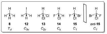 Apesar de apresentarem carbonos tetraédricos devido a sua hibridização sp3, o agente alquilante iodometano (12), pertencente ao grupo pontual C3v, e o diclorometano (13), um solvente orgânico de simetria C2v, são mais rigorosamente descritos por outros grupos pontuais por não possuírem exatamente os mesmos elementos de simetria que um tetraedro perfeito, como o metano (8, Figura 4). O clorofluorometano (14, Cs), um gás refrigerante conhecido como Freon 31, possui como único elemento de simetria um plano que passa pelos dois halogênios e pela bissetriz do ângulo formado pelas ligações H-C-H. Já um carbono ligado a quatro substituintes diferentes, como no bromoclorofluorometano (15), é um centro estereogênico e possui dois possíveis arranjos espaciais distintos (grupo pontual C1) que são imagens especulares um do outro por não possuírem um plano de simetria, centro de inversão ou eixo de rotação impróprio, sendo descritos como R ou S, segundo as regras de Cahn-Ingold-Prelog.34