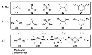 ![]() Figura 7. A: Compostos de simetria C2v. B: Compostos em que a média de seus rotâmeros pertencem ao grupo pontual C2v. C: conformações discretas para os rotâmeros do éter dimetílico 22