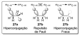 Essa barreira energética foi determinada por cálculos ab initio, a partir da aplicação da Termodinâmica Estatística à análise espectroscópica vibracional do etano.53 Uma intensa discussão na comunidade de Química Teórica foi dedicada à origem dessa barreira rotacional atribuída às contribuições de efeitos estéricos e estereoeletrônicos.54 O componente estérico deriva da repulsão entre as nuvens eletrônicas das ligações σC-H vicinais (repulsão de Pauli) que é maximizada na conformação eclipsada 27b (D3h). Já o componente estereoeletrônico estabilizante deriva da interação entre um orbital σC-H e o orbital σ*C-H vicinal (hiperconjugação).55 Uma vez que essa interação é máxima quando ambas as ligações estão em uma conformação anti-periplanar (180° em relação uma a outra), esse efeito estabilizante é maximizado na conformação alternada do etano (27a, D3d, Esquema 1 e Figura 8).