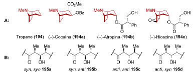 ![]() Figura 10. Padrões estruturais identificáveis. A: Alcaloides tropano (194); B: Estereotríades 195a-d presentes em policetídeos