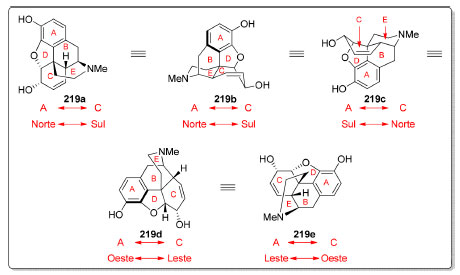 Produtos de reações bem estabelecidas como a reação de Diels-Alder170 e a anelação de Robinson171 apresentam conectividades e arranjos estereoquímicos importantes de serem reconhecidos. Uma aplicação do reconhecimento de padrões cuja visualização exige desconexões adicionais é encontrada na síntese da (±)-vernolepina (212, Esquema 46A), uma bislactona de origem natural que apresentou atividade antitumoral in vitro contra células de carcinoma nasofaringeal. Na síntese da (±)-vernolepina (212) realizada pelo grupo de Danishefsky, a origem dos anéis A e B foi traçada ao cicloaduto 213 resultante da reação de Diels-Alder entre o dieno 214 e o dienófilo cíclico 215.172 Deve-se observar que, para a instalação da lactona presente no anel A da (±)-vernolepina (212), foi necessária uma clivagem oxidativa de 216 (Esquema 46B), seguida por uma redução e uma transesterificação (67%). Ainda que não conheçamos o mecanismo neural pelo qual o reconhecimento de padrões opera, pode-se afirmar que ele se beneficia de um acúmulo de informações prévias sobre possíveis padrões estruturais e do processo cognitivo de superposição de imagens. Representar uma mesma estrutura de vários ângulos diferentes é um recurso simples e acessível que facilita a identificação de tais padrões. Isso permite comparar cada uma das múltiplas perspectivas representadas com estruturas guardadas na memória − ou em anotações pessoais − e eleger o material de partida ou intermediário sintético mais apropriado para a síntese em questão. Sempre se deve ter em mente que a escolha da matéria-prima é um dos aspectos mais importantes de um planejamento sintético, inseparável do custo operacional, eficiência e escalabilidade de uma rota sintética. A morfina (219) é um alcaloide pentacíclico (Figura 11) para o qual mais de 30 sínteses totais já foram descritas.173 Um ícone do esforço da comunidade sintética em sua busca por aperfeiçoar estratégias e aplicar novas reações, constituindo-se em um campo de provas para avaliação de novas metodologias sintéticas. A morfina (219) foi selecionada para ilustrar como diferentes maneiras de representar uma estrutura tridimensional complexa permitem visualizar aspectos que seriam difíceis de ver de outro modo (Figura 11).174