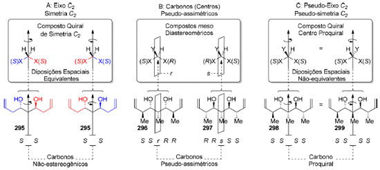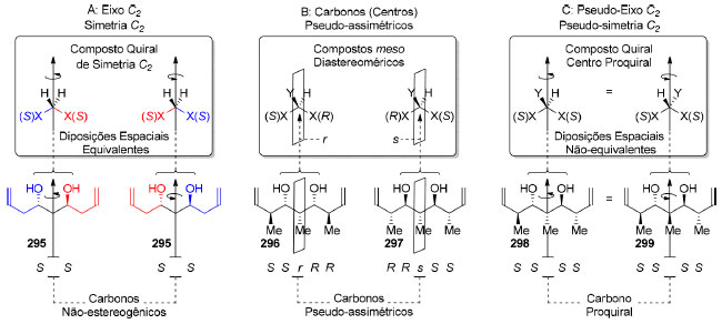 Para fins de consistência conceitual, é preciso mencionar que Ley e colaboradores se referem à identificação de um pseudo-eixo C2 na estrutura da (+)-espongistatina 1 (278). Entretanto, na literatura de síntese orgânica o uso desse termo é tipicamente associado a um arranjo estereoquímico diferente.207 De acordo com nossa compreensão,208 uma estrutura de simetria pseudo-C2 se refere a um composto quiral que possui um centro proquiral ligado a dois grupos enantiotópicos (Figura 12).209,210 Essa disposição espacial211 foi utilizada não só em estratégias sintéticas212,213 como no planejamento e síntese de catalisadores.214 Para facilitar a compreensão desta disposição espacial, compostos contendo um eixo C2 (Figura 13A), um centro pseudo-assimétrico (Figura 13B) e um pseudo-eixo C2 (Figura 13C) estão representados lado a lado. Por definição, uma rotação em torno de um eixo C2 verdadeiro resulta em uma disposição espacial equivalente à original (Figura 13A). Diferente de um centro assimétrico, um composto contendo um carbono pseudo-assimétrico é meso devido a presença de um plano de simetria (Figura 13B). Ao se comparar com as estruturas das figuras 13A e 13B, o pseudo-eixo C2pode ser compreendido como o eixo que coincide com um eixo C2 hipotético que estaria presente caso o carbono sp3 proquiral não estivesse presente ou não fosse proquiral. Diferente de um eixo C2 verdadeiro, uma rotação em torno de um pseudo-eixo C2 resulta em uma disposição espacial não-equivalente à original, o que é perceptível ao se observar a posição dos substituintes no carbono proquiral.