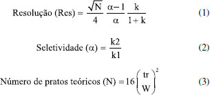 A partir dos resultados, calcularam-se os valores de Pratos teóricos, N, Resolução, Res, e Seletividade, α, para os picos cromatográficos, os quais são apresentados na Tabela 3.
