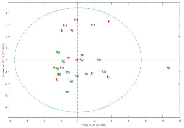 ![]() Figura 2. Gráfico em duas dimensões de scores de caracterização de amostras de solo de Lapa, PR. Amostras de1 a 15 (losangos) são agroecológicas e amostras de 16 a 30 (quadrados) são convencionais
