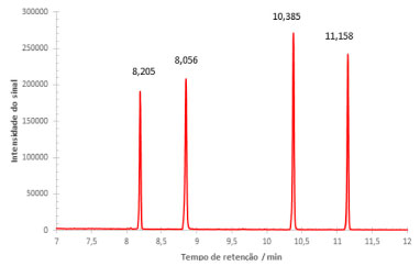 A partir da ferramenta de espectrometria de massas do software utilizado, os picos correspondentes foram encontrados e integrados, obtendo os espectros de massas. Pela biblioteca do NIST (National Institute of Standards and Technology), os analitos correspondentes foram identificados de acordo com as fragmentações de massas. Trifluralina apresentou tempo de retenção igual a 8,205 min, atrazina igual a 8,856 min, alaclor igual a 10,385 min e clorpirifós igual a 11,158 min. Considerando a programação de temperatura, o tempo total de análise foi igual a 20,5 min. O cromatograma da curva analítica, construída por superposição de matriz, é apresentado a seguir (Figura 5).
