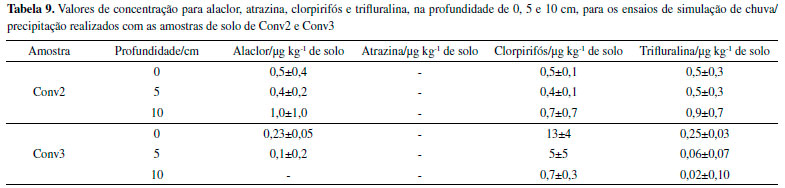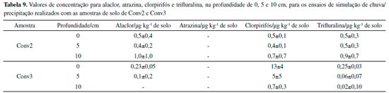 Os valores de concentração de agrotóxicos foram obtidos a partir da subtração entre as médias das concentrações obtidas nas 3 réplicas e a concentração obtida no tubo denominado controle. Considerando-se os valores de concentração de agrotóxicos que foram fortificados ao solo aos valores de concentração que foram encontrados nas diferentes porções do mesmo, pode-se fazer afirmações prévias a respeito do comportamento conjunto desses agrotóxicos. Para o alaclor nota-se comportamento semelhante em Conv2 e Conv3, ou seja, nas camadas de 0 a 5 cm apresentou concentrações semelhantes, apresentando maior concentração (1,0 μg kg-1) em 10 cm para o ponto Conv2. Vryzas e colaboradores (2012) identificaram a persistência de baixas concentrações de alaclor nas amostras de solução do solo, e o mesmo resultado observado neste trabalho, uma vez que o composto foi identificado em baixas concentrações no solo que sofreu lixiviação. Este composto apresenta baixo valor de koc, e caráter não-ionizável e médio potencial de lixiviação de água subterrânea, de forma que a presença do mesmo se deve à interação com a matéria orgânica do solo.10,12,30 Para os herbicidas não-iônicos, como alaclor, é possível obter correlação linear positiva entre valores de koc e teores de C orgânico do solo. Para solos brasileiros, essa correlação é mais acentuada, podendo-se estimar a sorção desses compostos com base nos teores de C orgânico.30 Atrazina não foi detectada em nenhuma amostra de solo do referente ensaio. Quando comparado com os 4 analitos de interesse, o composto apresenta baixo valor de Log kow (coeficiente de partição octanol/água 2,7), e maior potencial de lixiviação de água subterrânea.10 Ou seja, dentre os 4 analitos estudados, é o composto que apresenta menor tendência em ficar associado à matéria orgânica do solo, tendo potencial de lixiviar e permanecer no meio hidrofílico. Também de acordo com o estudo de Fenoll et al. (2011), a atrazina está entre os agrotóxicos que apresentam maior lixiviação, e este efeito pode ser potencializado conforme o pH diminui, o que ocorre com o aumento da profundidade para as amostras analisadas neste estudo.37 De acordo com Vryzas et al., o tempo de meia vida de atrazina varia de acordo com profundidade. Neste estudo, os valores de tempo de meia vida da atrazina, em amostras de solo, variaram de 5 a 18 dias nas camadas superficiais e aumentaram à medida que a profundidade do solo aumentou, atingindo os valores de 43 dias na camada de 80 e 110 cm de profundidade. Tais observações mostram que adsorção, persistência e lixiviação interagem entre si. Além disso, se considerar que o tempo de meia vida do composto é maior conforme se aumenta a profundidade, aumenta-se a probabilidade do mesmo atingir águas subterrâneas. Portanto, considera-se que o tempo de meia vida de atrazina, em geral, é de 60 dias. Patterson et al. (2000) e Close et al. (1998) observaram uma lixiviação mais rápida de atrazina em solos argilosos do que em solos arenosos, fato que também é importante se considerar que as amostras de solo estudadas apresentam textura média quando se considera os teores de argila. Portanto, seriam necessários novos estudos de comportamento de atrazina em camadas inferiores a 10 cm de solo. A atrazina também é um dos agrotóxicos que sofre rápida transformação para seus metabólitos, podendo ser um dos efeitos que justificam a não identificação do composto em nenhum ensaio. Fenoll e colaboradores afirmam, também a partir de estudos de lixiviação de agrotóxicos em amostras de solo, que os valores de concentrações obtidos foram crescentes considerando atrazina, alaclor, trifluralina e clorpirifós. Os agrotóxicos não-iônicos não reagem com a água e não apresentam carga elétrica, independentemente do pH do meio.30 Portanto, pH e CTC são somente consideráveis quando se trata da presença de atrazina no solo, uma vez que os demais analitos estudados não interagem com a água. Para o clorpirifós, nota-se que em Conv2 passando da superfície até 10 cm de profundidade, as concentrações foram semelhantes, levando em conta os valores de desvios-padrões. Já em Conv3 a concentração diminuiu conforme aumenta a profundidade. Observa-se comportamento semelhante ao já visto para as amostras individuais de solo. O clorpirifós foi o composto que apresentou maiores valores de concentração (13±4 e 5±5 μg kg-1), e esse resultado deve-se às propriedades físico-químicas do composto, uma vez que as mesmas amostras de solo foram avaliadas para os demais compostos. Dentre os quatro agrotóxicos estudados, o clorpirifós é aquele que apresenta o segundo maior valor de koc, com pequeno potencial de lixiviação, sendo não-ionizável.10,30 O tempo de meia vida de clorpirifós pode variar, entre 10 e 90 dias, sendo esse fato também determinante na possibilidade de extrair este composto do solo. A trifluralina apresentou concentrações semelhantes de 0-10 cm em Conv2. Já em Conv3 apresentou maior concentração na superfície. A trifluralina caracteriza-se como um composto não-ionizável, apresentando pequeno potencial de lixiviação de água subterrânea e baixo valor de Kow.10,30 Dessa forma, a presença do composto nas amostras de solo deve-se ao seu alto valor de koc, embora esse composto também apresente elevada volatilidade e t1/2 de 9 h em água.34 De forma geral, a simulação da chuva/precipitação nas amostras de solo apresentou resultados para os agrotóxicos de forma semelhante ao já identificado nas amostras individuais de solo, confirmando que as propriedades físico-químicas dos agrotóxicos, bem como as características do solo, têm grande influência no comportamento ambiental.