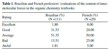 All professors considered the intermolecular forces an important subject in organic chemistry. However, only 66.67% of the Brazilian professors and 80.00% of the French professors considered average/bad/awful how the organic chemistry textbooks present the intermolecular forces. The survey's results motivated us to investigate the IMFs in more detail in widely adopted organic chemistry textbooks in Brazil.