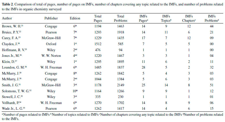 I. Departamento de Química Orgânica e Inorgânica, Universidade Federal do Ceará, 60451-970 Fortaleza - CE, Brasil Recebido em 19/03/2021 *e-mail: nunes.ufc@gmail.com The paper analyzes fifteen organic chemistry textbooks commonly used in Brazilian universities to examine intermolecular forces' coverage in them. The findings revealed that the intermolecular forces are spread over a few pages (less than 1%) in a fragmented way, and over several chapters that do not provide enough information to help create a clear image in the student's mind. Thirteen textbooks contained end-of-chapter problems related to intermolecular forces. However, less than 1.3% of the total (212) are associated with intermolecular forces. This deficient approach to intermolecular forces in Organic textbooks can lead to teachers' lack of interest in teaching the subject, leading to students failing to learn this important organic chemistry topic. INTRODUCTION Intermolecular forces (IMFs) are weak attractive forces used to explain the attraction between particulate matter. They are responsible for many phenomena in our lives, like the effects of adsorption (chromatography) and viscosity, adhesion, cohesion, differences in melting and boiling points, physical states of the compounds, solubility, among many other observations. The mastery of intermolecular forces is crucial to chemistry students because the IMFs play a central role in predicting and explaining how molecular-level systems behave in chemical and biological systems. Thus, the importance and diversity of IMFs make them a valuable component of curricula in chemistry, biochemistry, and biology courses. Unfortunately, authors have reported students' difficulties understanding the concepts of particulate matter and the intermolecular forces.1-17 Also, students have problems understanding how molecules are held together without chemical bonds between them,1,2 melting and boiling processes,7,8 and rarely can draw and explain the types of IMFs between chemical species.9,10 Although study guides, solution manuals, websites, and applications are increasingly used as complementary educational tools by instructors in their disciplines, textbooks still play a vital role in determining course curricula, both in specific content and pedagogical approaches. Dense courses like Chemistry, a content-filled subject, make most instructors derive their course material directly from textbooks by considering their coverage and presenting the contents.18 The best option will be that one that motivates students to spend the highest time interacting with the book. This study analyzes organic chemistry textbooks to determine common patterns and assess how they introduce the intermolecular forces' contents. Moreover, the manuscript's information can help organic chemistry instructors choice about adopting an organic chemistry textbook considering the IMFs content.