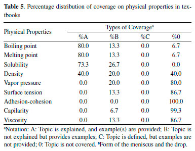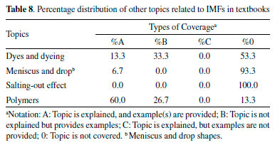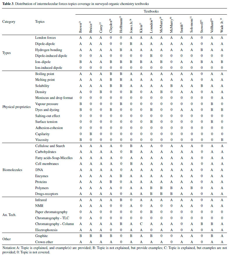 COVERAGE OF TOPICS RELATED TO INTERMOLECULAR FORCES We have also surveyed the organic chemistry textbooks currently used in Brazilian universities to reveal which topics related to the intermolecular forces are included in them. We analyzed 34 issues distributed in five categories: i) types; ii) physical properties; iii) biomolecules; iv) analytical techniques; and (v) other. Tables 3-8 summarize the results of the search.