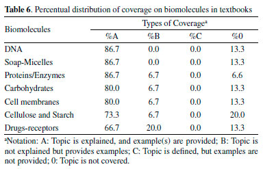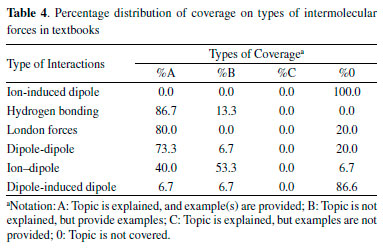 Although all analyzed textbooks present intermolecular forces, the examination of Table 1 revealed that they do that in a small number of pages (0.9% on average). Besides, topics related to intermolecular forces are spread over several chapters (4.8 on average) in all books, with no specific chapter to address the theme. This weak approach to intermolecular forces in textbooks can lead to teachers' lack of interest in teaching the subject, failing to learn this vital organic chemistry topic.