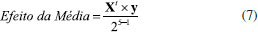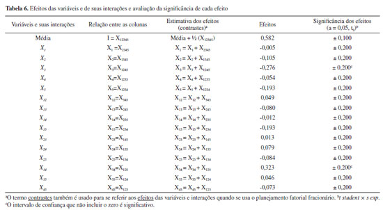 A linearidade da curva analítica da cafeína foi expressa usando o coeficiente de determinação (r2 = 0,990), indicando uma ótima relação linear (r2 próximo a 1). No entanto, para validação de procedimentos analíticos é recomendado que a linearidade seja avaliada por métodos estatísticos de análise de variância (ANOVA).27 O Teste F foi aplicado para verificar a significância da regressão, uma vez que um Fcalculado maior que o Ftabelado indica uma regressão linear adequada e, consequentemente, um modelo matemático que represente satisfatoriamente o experimento. O modelo apresenta um Fcalculado (833) maior que o F1,10 (tabelado) (4,97) indicando uma regressão linear ideal. Além disso, o modelo apresentou um Fcalculado (5) próximo ao F4,6 (tabelado) (4,53), indicando que não há evidência de grande falta de ajuste no modelo. Desse modo, pode se considerar, com 95% de confiança, que a curva analítica está significantemente correta e bem ajustada para a quantificação da cafeína e que a hipótese da linearidade não pode ser descartada para a curva analítica construída (ou seja, a hipótese nula não pode ser rejeitada). Avaliação das variáveis usadas no planejamento fatorial fracionário 25-1 A partir do planejamento fatorial fracionário de resolução V (25-1) foi realizada uma avaliação das cinco variáveis usadas para a extração de cafeína usando a máquina de café expresso. O planejamento fatorial fracionário executado neste trabalho e as concentrações de cafeína (% m/m) extraídas na máquina de café expresso são apresentados na Tabela 5. A Tabela 5 foi construída com base na Matriz X do planejamento fracionário 25-1 (Tabela 1) e apresenta as cinco variáveis e os dois níveis estudados, gerando 16 experimentos. A partir das respostas (concentração de cafeína % m/m) geradas no planejamento fatorial fracionário foram calculados todos os efeitos e sua significância. Vale destacar que a extração líquido-líquido da cafeína dos cafés moídos empregando o diclorometano como solvente extrator, apresenta uma eficiência de extração de 98 - 99 % de acordo com a literatura.24,28-30 Além disso, de acordo com a Resolução CNNPA nº12/1978, os cafés devem conter pelo menos 0,7% m/m de cafeína.31 Em todos os experimentos realizados obteve-se um teor de cafeína maior que 0,7% m/m. Vale destacar que o teor de cafeína obtido em todos os ensaios está em conformidade aos encontrados na literatura.32-35 Cálculo dos efeitos Para o cálculo dos efeitos de cada variável e dos efeitos das suas interações foi necessário transpor a Matriz X (Tabela 1) e multiplicá-la pelo vetor y (respostas da concentração de cafeína apresentadas na Tabela 5). Após isso, a multiplicação (Xt ×y ) foi dividida pela metade do número de experimentos diferentes executados, obtendo os valores dos efeitos das variáveis e de suas interações (Eq. 6) (Tabela 6). Os efeitos se referem a diferença entre duas médias, a média do nível superior menos a média do nível inferior. Como a metade dos experimentos é realizada em cada nível, os valores dos efeitos são divididos pela metade do número de ensaios realizados. ![]()