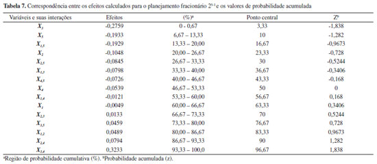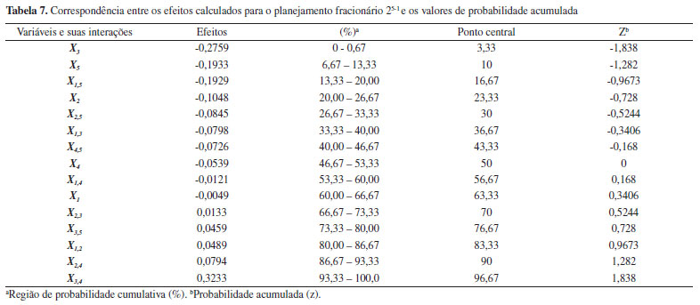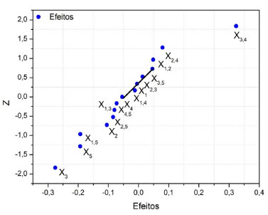 O gráfico normal foi obtido plotando os valores dos efeitos versus os valores de probabilidade acumulada (z), ambos em ordem crescente (Figura 6). Os efeitos não significativos devem se ajustar a uma distribuição normal centrada em zero. Já os efeitos significativos devem se afastar dessa distribuição normal. Dessa forma, os efeitos que se ajustam próximo ao ponto zero das abscissas (probabilidade acumulada de 50%) são considerados não significativos. Em contrapartida, os efeitos X3 e X34 estão mais afastados do ponto zero das abscissas e, portanto, são considerados significativos, corroborando com a avaliação apresentada no gráfico de pareto. Vale destacar que nos planejamentos fracionários não são realizadas duplicatas, uma vez que isso forneceria mais experimentos, o que contradiz a redução proposta nos planejamentos fracionários. Entretanto, alguns trabalhos têm empregado uma triplicata em um ponto central para estimar a significância de cada efeito.20 Sendo assim, como normalmente não há duplicatas ou repetição nos pontos centrais ao usar os planejamentos fracionários, deve-se estimar a significância dos efeitos usando as interações de maiores ordens (conforme foi apresentado na secção para obtenção do gráfico de pareto) ou empregar o gráfico de probabilidade normal para avaliar a significância dos efeitos.