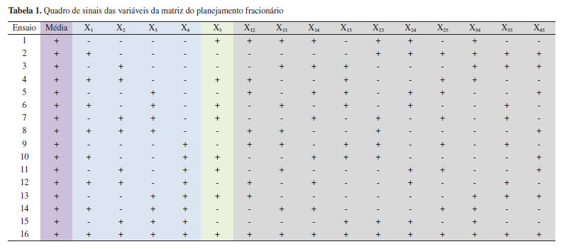 Passo 1: Construir a coluna da média com nível alto (+ 1) para todos os 16 ensaios (coluna colorida em roxo na Tabela 1). Passo 2: Construção de um planejamento completo 24 para os fatores principais (variáveis) X1, X2, X3 e X4 (coluna colorida em azul na Tabela 1). Os níveis da coluna X1 se revezam entre o nível baixo (-1) e nível alto (+1), seguido pelo revezamento dois a dois (-1-1+1+1), quatro a quatro (-1-1-1-1+1+1+1+1) e oito a oito (-1-1-1-1-1-1-1-1+1+1+1+1+1+1+1+1) para as colunas X2, X3 e X4, respectivamente. Passo 3: Atribuir à coluna X5 o resultado do produto dos níveis das 4 variáveis principais (X1, X2, X3 e X4) de cada ensaio (Eq. 4) (coluna colorida em verde na Tabela 1). ![]() Passo 4: Atribuir às colunas dos fatores de 2ª ordem (X12; X13; X14; X15; X23; X24; X25; X34; X35 e X45) (coluna colorida em cinza na Tabela 1) o resultado do produto dos seus respectivos efeitos principais em cada ensaio (Eq. 5).15 ![]() sendo i e j os índices das variáveis usadas no planejamento (1, 2, 3, 4 e 5). Observe que foram usados somente as variáveis principais e as interações de 2ª ordem para construir a matriz do planejamento 25-1, visto que os efeitos das interações de maiores ordem (3ª e 4ª) estão misturadas com estes efeitos principais e de 2ª ordem (Figura 1). Vale ressaltar que ao construir a matriz do planejamento fracionário 25-1 há uma perda de informação sobre as respostas dos experimentos. Entretanto, essa perda de informação não é expressiva, pois a confusão causada entre os efeitos principais e os efeitos de interações tem como objetivo dar importância somente aos efeitos significativos que serão avaliados pelo gráfico de pareto e pelo gráfico de probabilidade normal, conforme será visto nos resultados e discussão.15 Observe que os ensaios 2, 3, 5, 8, 9, 12, 14 e 15 da Tabela 1 correspondem aos mesmos ensaios da Figura 2, se considerar somente as variáveis principais (exceto para variável 5) e interações de 2ª ordem. Os ensaios faltantes (1, 4, 6, 7, 10, 11, 13 e 16) são os ensaios presentes na matriz alternativa (Figura 1S).