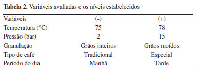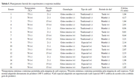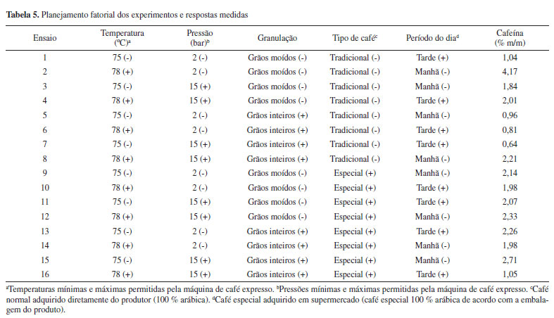 PARTE EXPERIMENTAL Materiais e reagentes Os frascos e vidrarias empregados nas análises foram lavados com Extran MA 02 Neutro 5% v v-1 (Merck, Alemanha) e água deionizada antes das análises. Diclorometano P.A. ACS (Vetec, Brasil) foi usado para a extração da cafeína dos cafés. A água deionizada (condutividade ≤ 5,0 µS cm-1) foi preparada por um deionizador (Permution®, modelo 1800 Evolution, BR). As soluções-padrão usadas para construção da curva analítica foram preparadas após diluições sucessivas da solução estoque de 100 mg L-1 de Cafeína (Sigma-Aldrich, BR). As diluições foram executadas em balões volumétricos de 25 mL e completadas até o ponto de aferição com diclorometano P.A (Vetec, Brasil). Amostras e equipamentos Foram usados cafés especiais e tradicionais torrados e moídos e em grãos adquiridos em supermercados brasileiros. Uma cafeteira multipressão de 2 bar e 15 bar com reservatório de água de 950 ml (Três Corações, G1 lov, Brasil) foi usada para o preparo do café. Já para a análise da cafeína foi empregado um espectrofotômetro de absorção molecular UV/Vis (BioMate 3S, Thermo Fisher Scientific, EUA). Planejamento experimental Os cafés foram extraídos usando a máquina de café expresso, variando a temperatura (X1), pressão (X2), granulação (X3), tipo de café (X4) e período do dia (X5). As variáveis X1, X2, X3, X4 e X5 foram estudadas usando o planejamento fatorial fracionário com dois níveis (25-1), a fim de verificar a significância dessas variáveis na obtenção da máxima extração de cafeína das bebidas de café preparadas na máquina de café expresso. A Tabela 2 apresenta as 5 variáveis e os dois níveis estudados, gerando 16 experimentos. Para evitar resultados tendenciosos, os 16 experimentos foram realizados de forma aleatória.