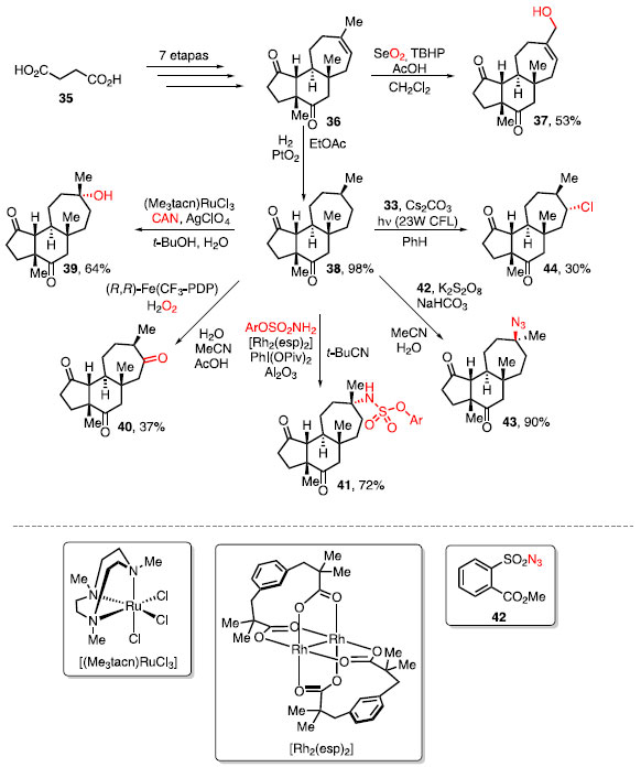 O composto 36 foi obtido em 7 etapas a partir do ácido succínico (35), e a partir dele, foi realizada uma oxidação de Riley para acessar o produto 37 e uma hidrogenação para acessar ao intermediário 38. A partir do composto 38, foram realizadas reações de oxidação catalisadas por rutênio [(Me3tacn)RuCl3] e ferro (Ã,Ã)-Fe(CF3-PDP) para obter o álcool e a cetona 39 e 40, respectivamente. Do mesmo intermediário 38, foram realizadas uma aminação calatisada por ródio [Rh2(esp)2] e uma azidação envolvendo a molécula 42, obtendo os produtos 41 e 43, respectivamente. Por fim, foi realizada a cloração sitiosseletiva utilizando o reagente 33, cujo produto 44 foi obtido.23 Herzon e colaboradores aplicaram a mesma lógica de funcio-nalização C-H para obter derivados da pleuromutilina (51), um diterpeno utilizado como antibiótico, capaz de inibir a síntese de proteínas.24 Nesse caso, reações de sililação C-H catalisadas por irídio seguidas por uma oxidação de Tamao-Fleming para formar 1,3- e 1,4- dióis foram utilizadas (Esquema 7a).25 Diferente da metodologia descrita por Breslow, em que ocorre a ozonólise de olefina para a formação de dicetonas, a oxidação de Tamao-Fleming faz a conversão de uma ligação C-Si para o álcool correspondente, com o uso de H2O2 como oxidante.