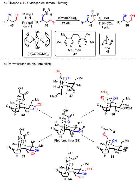 A hidroxila no C11 da pleuromutilina foi utilizada como um grupo diretor para funcionalizar as metilas nas posições C17 e C18, obtendo os produtos 52, 53 e 54 (Esquema 7b). Para obter o produto 53, a pleuromutilina foi tratada com dietilzinco para epimerizar o C12, e favorecer a oxidação no C17 da metila. Proteções das hidroxilas de C22 e C18 do intermediário 52, seguida da sequência sililação C-H e oxidação de Tamao-Fleming forneceu o produto 54. A hidroxila do C14 da pleuromutilina também foi utilizada como grupo dirigente para funcionalizar a ligação C-H das metilas das posições C15 e C16 do 51, para acessar aos compostos 55, 56 e 57. O tratamento de 51 com BOMCl, saponificação, redução de olefina, sililação C-H, oxidação de Tamao-Fleming, esterificação seletiva e hidrogenólise forneceu o produto 55, via isomerização do éster de O14 para O16. O álcool no C16 obtido foi acetilado, seguido da sililação C-H e oxidação de Tamao-Fleming, fornecendo o produto 56. O tratamento da pleuromutilina com trimetilortoformato e ácido sulfúrico forneceu o 4-epi-pleuromutilina, que foi submetida à saponificação, hidrogenação, sililação C-H e oxidação de Tamao-Fleming, formando o produto 57.26 Neste artigo de revisão abordaremos o desenvolvimento de metodologias para a funcionalização de ligações C-H que foram utilizados na modificação em estágio tardio de produtos naturais e fármacos. Os exemplos aqui apresentados envolvem catálise metálica e fotoquímica na formação de ligações C-C, C-O, C-N, C-S, C-Si, C-Halogênio. Funcionalizações de ligações C-H por meios eletroquímicos, organocatalisadas ou biocatalisadas não serão cobertos por este trabalho. Funcionalização de ligações C-H ativadas como, por exemplo, em posições alílicas ou benzílicas também não serão cobertas.