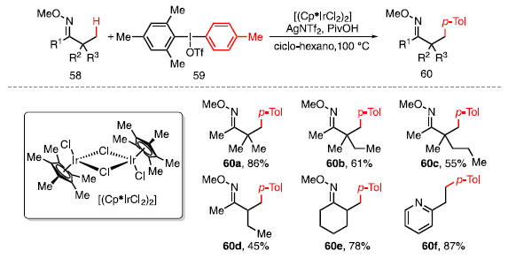 O aumento do volume estéreo causado pelos grupos adjacentes reduz gradualmente o rendimento, como observado em 60a-60c. Há seletividade para a funcionalização de ligações C-H na posição b primárias frente a secundárias, como observado na formação exclusiva de 60d. Substratos com hidrogênios na posição a se mostraram compatíveis com a metodologia, assim como composto cíclico 60e. Piridinas podem atuar como grupos dirigentes além de éteres de oxima, sendo capazes de fornecer produtos monoarilados com excelentes rendimentos, como visto em 60f. Após estudos computacionais, o mecanismo reacional proposto inicia-se com a coordenação da oxima 58 ao catalisador de irídio levando à formação do intermediário 61 (Esquema 9). Com o auxílio da base, a abstração do hidrogênio na posição b, formando o metalaciclo 62, ocorre via metalação-desprotonação concertada (da sigla em inglês, CMD), liberando ácido tríflico. Em seguida, a adição oxidativa do sal de diaril iodônio 59 no intermediário 62, na qual o átomo de irídio passa do estado de oxidação III para V, fornece o intermediário 63. Por fim, após uma etapa de eliminação redutiva, a oxima 60 é liberada e o ciclo catalítico é restaurado.31