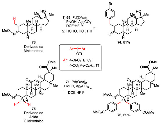 O derivado da metasterona 73, um esteroide anabolizante utilizado para aumentar o rendimento físico de atletas, considerada uma substância proibida em 2006 pela World Anti-Doping Agency (WADA),34 forneceu o produto monoarilado 74, em 81% de rendimento. Foi utilizado o sal de diaril iodônio 69, PivOH, Ag2CO3 e Pd(OAc)2, seguido pela hidrólise do éter de oxima em meio ácido. Essa condição reacional mostrou tolerância à presença de uma hidroxila terciária. Já o composto 75, um derivado do ácido glicirretínico, conhecido comercialmente como enoxolona, um triterpeno encontrado nas raízes das plantas da espécie Glycyrrhiza glabra (alcaçuz), que apresenta propriedades anti-inflamatórias, antivirais e antitumorais,35 forneceu um produto diarilado 76 em 69% de rendimento (Esquema 12).