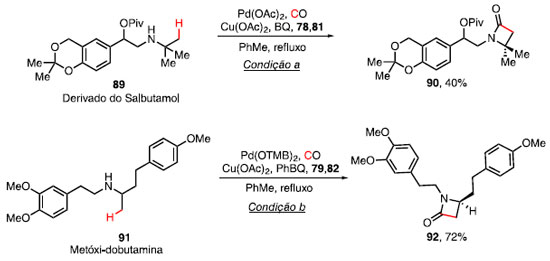 Com base nos estudos computacionais e efeito isotópico, a etapa de carbamoilação ocorre com o ataque da amina ao anidrido, obtendo a amida 87 e, com o auxílio de benzoquinona (80), ocorre a ativação da ligação C-H, formando o metalaciclo de 5 membros 88. A etapa da eliminação redutiva, juntamente com a regeneração do catalisador via oxidação por Cu(OAc)2, forneceu a b-lactama 83.36 O derivado do salbutamol 89, um fármaco utilizado no tratamento da asma por promover a dilatação dos brônquios, forneceu a b-lactama 90 com rendimento de 40%, quando utilizado a condição a (Esquema 15).37 Ao se utilizar a condição b para a reação de carbonilação C-H em um derivado da dobutamina 91, um fármaco desenvolvido nos anos 70 e usado no combate da insuficiência cardíaca por suas propriedades vascular e arritmogênica, o composto 92 foi obtido em 72% de rendimento.38