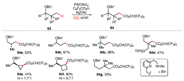 Yu e colaboradores desenvolveram uma metodologia catalisada por Pd(OAc)2 capaz de realizar reações de carbonilação e olefinação utilizando CO e etileno, respectivamente, em ligações C-H em posições ô ou g de éteres benzílicos 93, utilizando C6F5CO2H e AgOAc como aditivos em HFIP (Esquema 16).39 A utilização de um grupo diretor bidentado, aliado ao oxigênio do éter benzílico, controla a regiosseletividade da reação, obtendo ésteres 94.