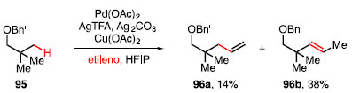 A análise das condições reacionais revelou que os produtos 94a-94c, provenientes de álcoois primários, secundários e terciários, respectivamente, são compatíveis com o sistema desenvolvido, fornecendo produtos com rendimentos moderados a altos, assim como substratos que possuem outro oxigênio coordenante como, por exemplo, 94d. Ligações C-H metilênicas em anéis como ciclopropano 94e e ciclobutano 94f também são seletivamente funcionalizadas. A carbonilação de uma ligação ô C-H foi possível como visto no produto 94g.39 A olefinação da ligação C-H do éter 95 ocorreu através de um mecanismo similar à reação de carbonilação, mas, nesse caso, com o uso de Pd(OAc)2, AgTFA, Ag2CO3 e Cu(OAc)2 para a inserção de etileno, um gás barato e abundante com enorme potencial sintético. Foram obtidos dessa metodologia os produtos olefinados 96a e 96b como isômeros, em 14% e 38%, respectivamente (Esquema 17).40
