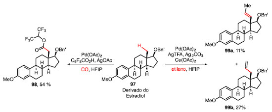 O derivado do estradiol (97), esteroide de importância para o sistema vascular e sexual feminino, se mostrou um substrato eficaz para expor o potencial de ambas as transformações de carbonilação e olefinação sob as condições mencionadas, obtendo o éster 98 em 54% e os isômeros 99a e 99b em 11% e 27%, respectivamente (Esquema 18).40