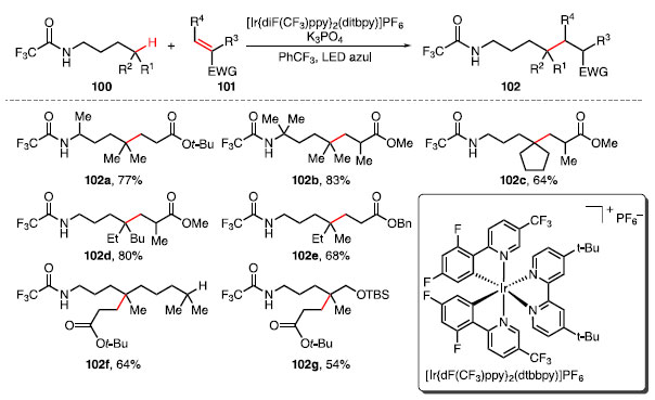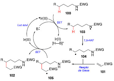 A presença do grupo trifluoroacetamida como grupo diretor facilita a transferência 1,5 do átomo de hidrogênio (1,5-HAT). Estudos revelaram que a reação ocorre em substratos que possuem substituintes a ao nitrogênio, fornecendo o produto 102a em bom rendimento. A variação do ambiente estéreo dos grupos substituintes ao redor da ligação C-H inerte tem pouca influência no rendimento das reações, fornecendo 102b-102e em rendimentos de moderados a bons. Há uma preferência para a funcionalização da ligação C-H através do 1,5-HAT frente a 1,6-HAT ou outra C-H terciária, como visto em 102f e 102g. O ciclo fotocatalítico proposto para essa reação consiste na irradiação de luz azul sobre o complexo de irídio, que passa para o estado excitado Ir(III)* que, com auxílio de uma base, abstrai o próton da ligação N-H da amida 100, formando o radical 103, e o complexo Ir(II) com a base protonada [B-H]+ (Esquema 20). Esse processo de transferência de um elétron entre duas espécies (do inglês, single-electron transfer, SET), é uma etapa importante para a formação de intermediário contendo radical, e para reações que passam por mecanismos radicalares.