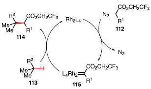 O escopo da reação revelou que o sistema é sensível ao ambiente estéreo próximo ao sítio terciário, sendo que quando esse se encontra impedido a reação ocorre em um sítio secundário ou terciário menos impedido 114a-114d. A diminuição da temperatura aumenta a regiosseletividade e enantiosseletividade em detrimento do rendimento, como indicado no produto 114c. A reação ocorre de maneira satisfatória com substratos que contêm outros grupos funcionais como, por exemplo, bromo 114e, éster 114f, e grupos nucleofílicos, como pirimidinas 114g.43 O ciclo catalítico para essa reação consiste na reação do complexo de dirródio com o composto diazo 112, formando o carbenóide 115, com a liberação de N2. O complexo 115, mais reativo, irá realizar a inserção C-H de alcano, fornecendo o produto 114, e regenerando o ciclo catalítico (Esquema 23).44